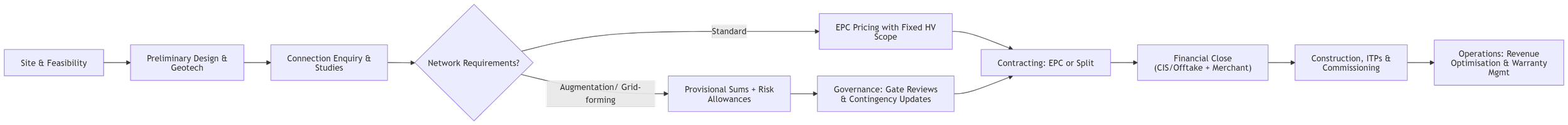 Contract structure. EPCs increasingly resist full wrap for grid performance where standards are evolving (e.g., grid‑forming behaviour); expect carve‑outs and provisional sums for connection works or adopt split contracts (OEM + Balance‑of‑Plant + HV). Align liquidated damages with realistic energisation sequences and ITP milestones.