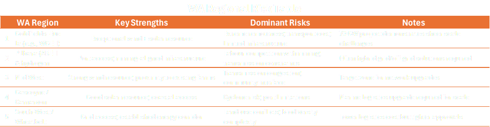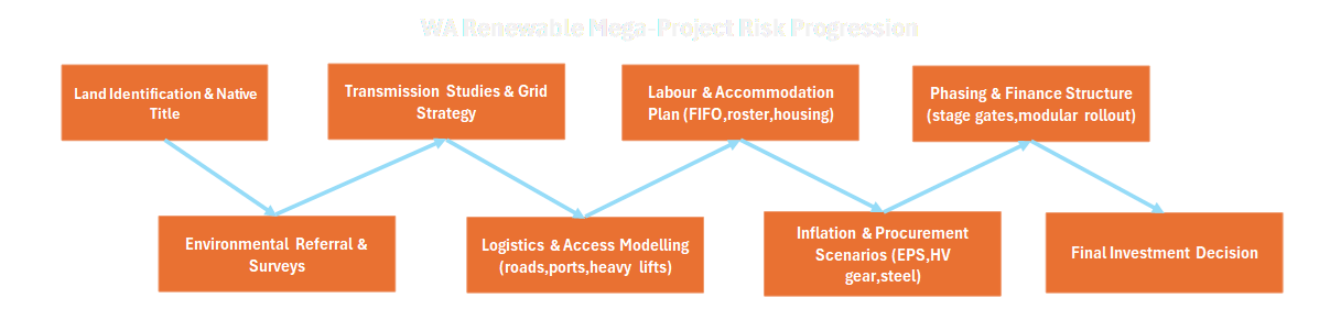 Synthesising risks across major WA renewable regions. Sources include WA Government approvals insights and published mega‑project contexts.